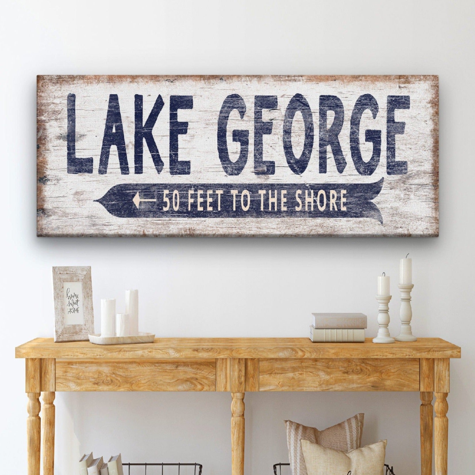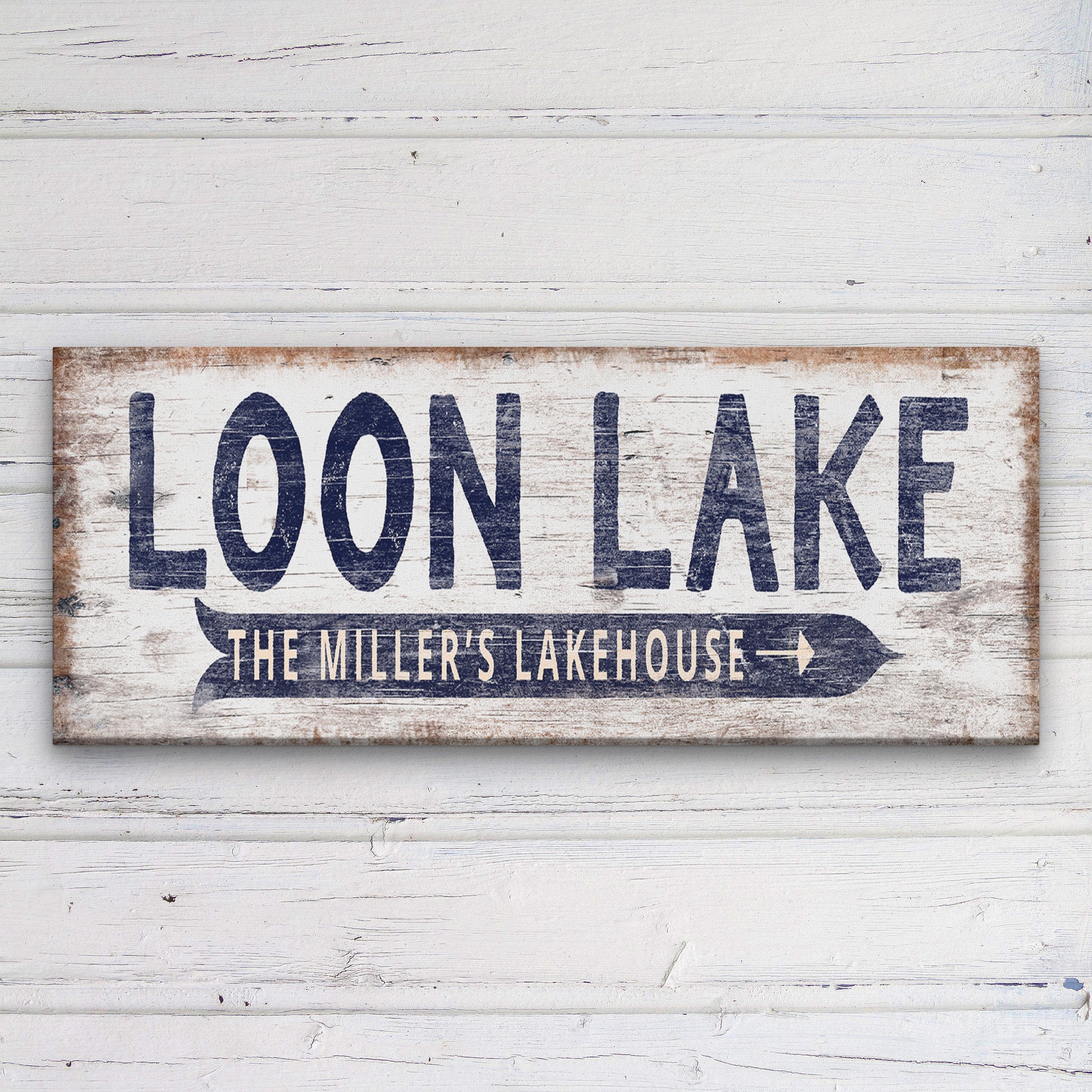 Create a totally unique CANVAS Lake Sign. Customized for your lake, youll be sure to be the envy of the neighborhood. Personalized Lake sign with directional arrow is designed to look like its been painted on distressed wood and living in the lake air for years. It comes ready to point family, friends, and guests towards the Lake...or personalize it further and point them wherever youd like!